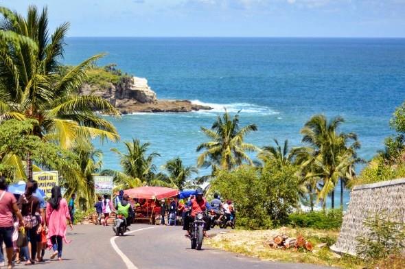 Pantai dengan pasir putihnya dan lambaian pohon kelapa ini dipagari dengan perbukitan yang menjulang.